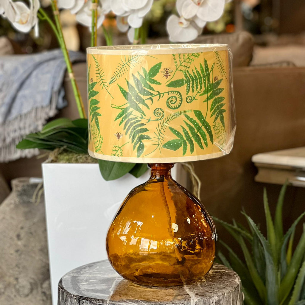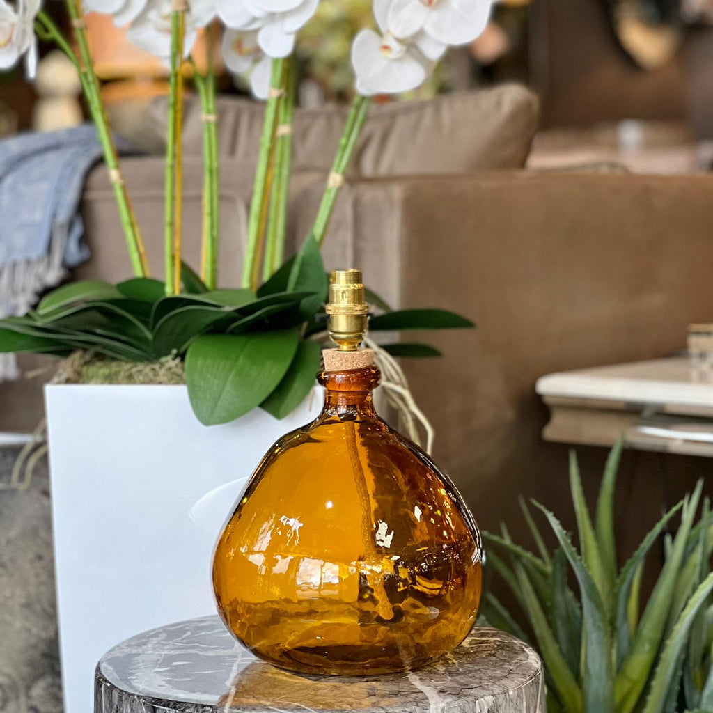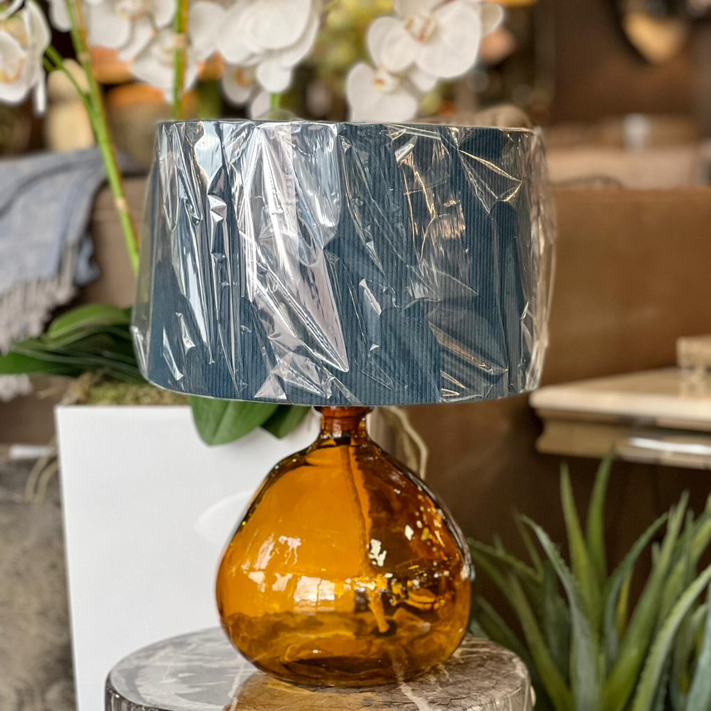 A pretty blown recycled glass lamp with cork and brass fittings. Wired with a cotton braid flex. This style of lamp complements many styles of interior from contemporary to traditional. Shade not included.