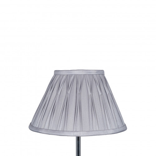 An elegant 30cm empire shade created using a silk effect material which  has a beautiful pinch pleat. Finished in a neutral grey colour with soft balloon lining this shade will sit beautifully on most base styles creating a timeless classic.