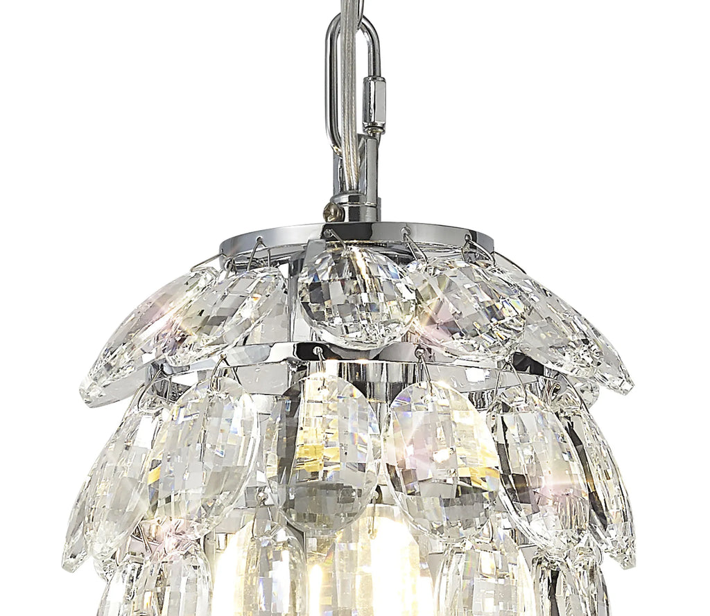 Cassia  is the epitome of a stunning crystal collection. Staying true to the high quality and distinctive designs, this range hosts a substantial abundance of clear crystal pieces. Delicately displayed in a tiered cascading form to outline a striking feature. Available in three colour finishes with various sizes from a 1 light pendant to a 30 light acorn and complementing table, floor & wall lights.