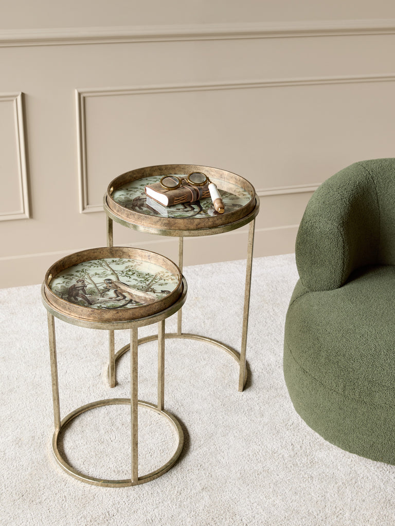 A characterful duo of nesting side tables, each featuring a vintage-style monkey scene set beneath a smooth glass top. Resting on slender iron frames with an antique gold effect, the design balances playful imagery with refined structure. The taller table stands at 68 cm, the smaller at 57 cm—ideal for layered styling or for placing individually throughout a space. Cream and gold tones offer warmth and versatility, while the smooth finish and antiqued frame add depth and texture.