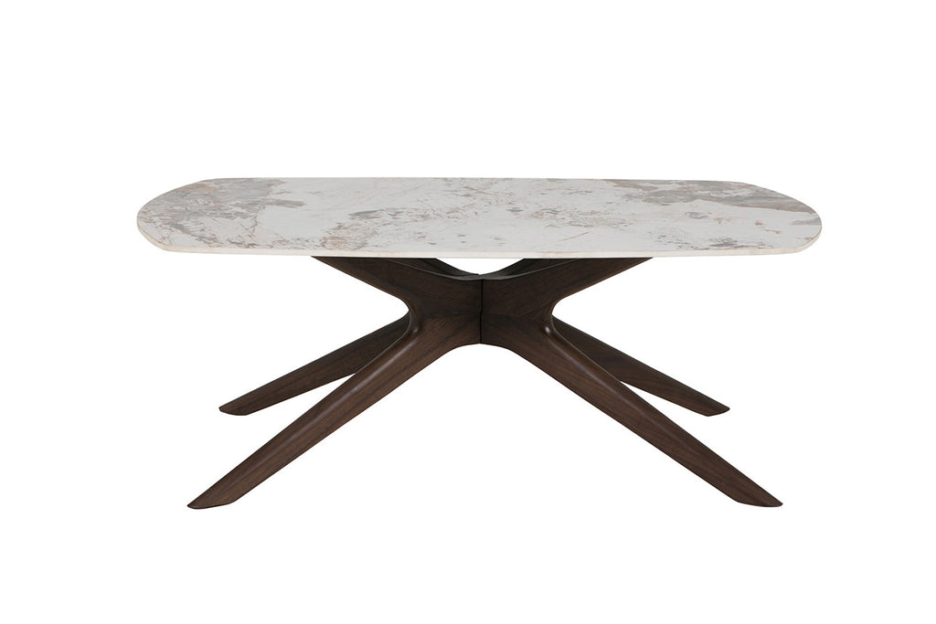 The Ashford coffee table is a modern addition to any living space. It blends style and practicality with its sophisticated walnut veneer on solid birch legs and sintered stone table top.