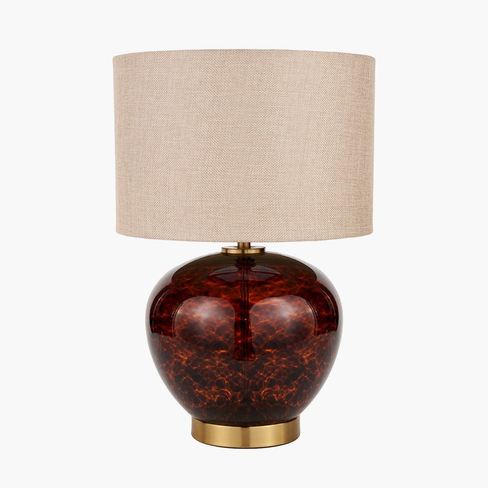 Make a bold statement with this striking Tortoiseshell Glass and Brushed Gold Table Lamp. The on-trend tortoiseshell design is perfectly accentuated by the brushed gold base, creating a piece that is both stylish and sophisticated. The beautifully curved lamp base is complemented by a textured, natural cylinder shade, adding a touch of elegance to any room.
