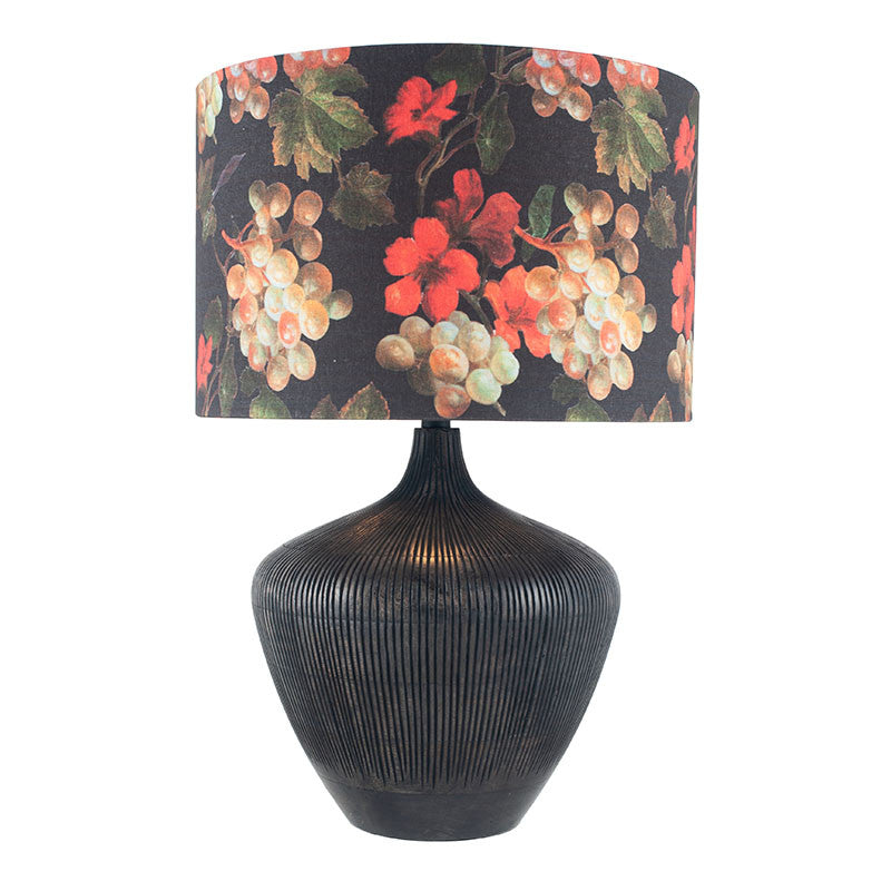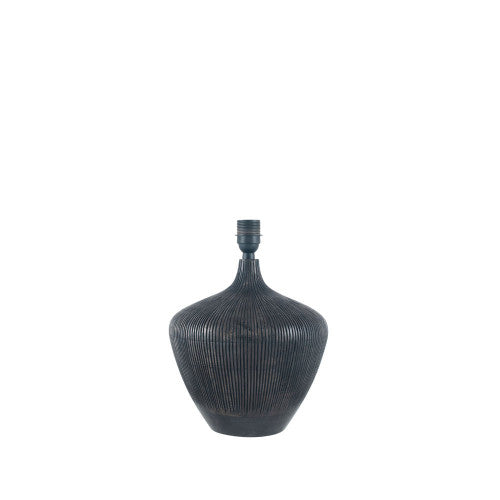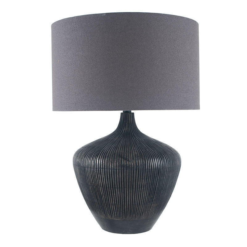A curved elegant shape, this contemporary lamp has a wood base with a stunning etched design across it, finished in a striking antique black. Finish with one of our stylish cylinder shades from our extensive range. Recommended lampshade size: 35cm diameter. Shade sold separately.