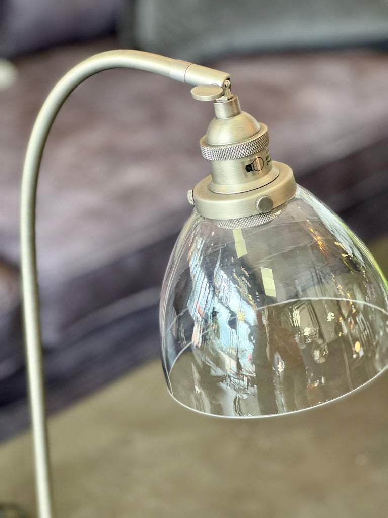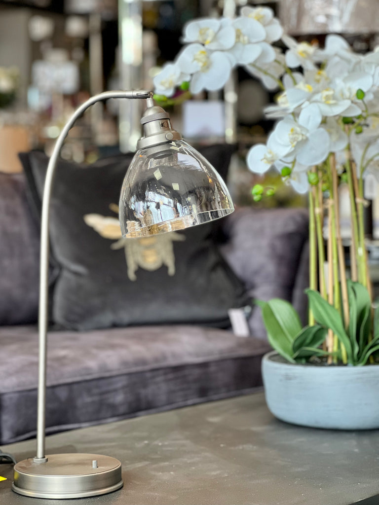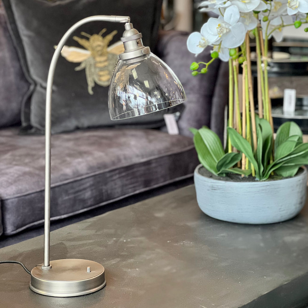 An authentic 'retro' style adjustable table light, finished in brushed silver paint with authentic knurled lamp holder details and clear glass shades. Featuring an adjustable knuckle and accessible on/off switch, pair this table light with filament LED lamps for that perfect industrial style. The perfect addition for today's stylish homes to create that on trend bar, bistro look.