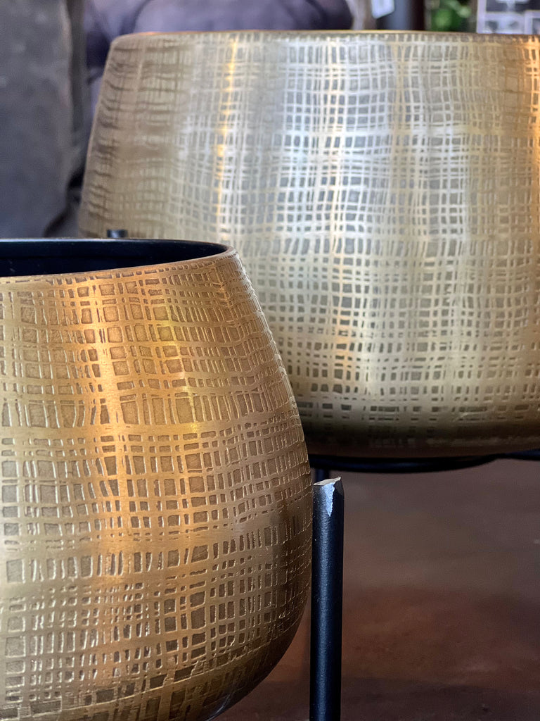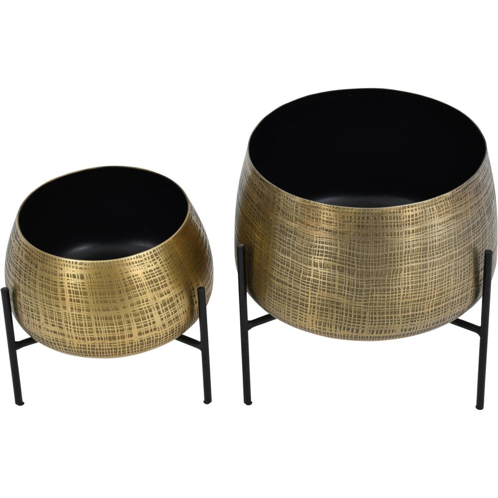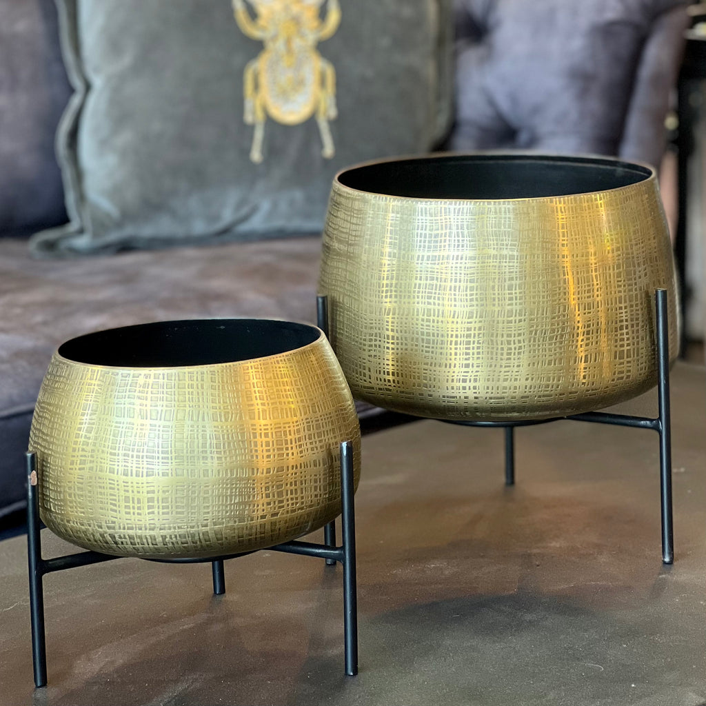 Spruce up indoors with these beautiful contrast planters. Indoor houseplants are a breath of fresh air, but often look underwhelming when potted. House them in style with this antique brass set of two planters which stand on black legs for a cool, contemporary twist. The brass pot element is finished with an etched antique texture to add a touch of ornate design stylings.