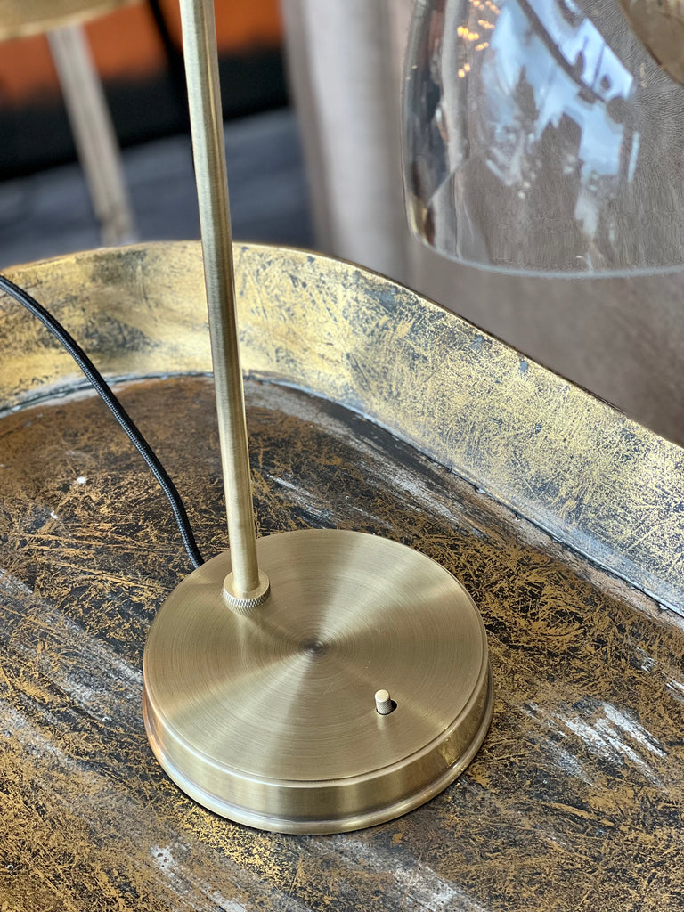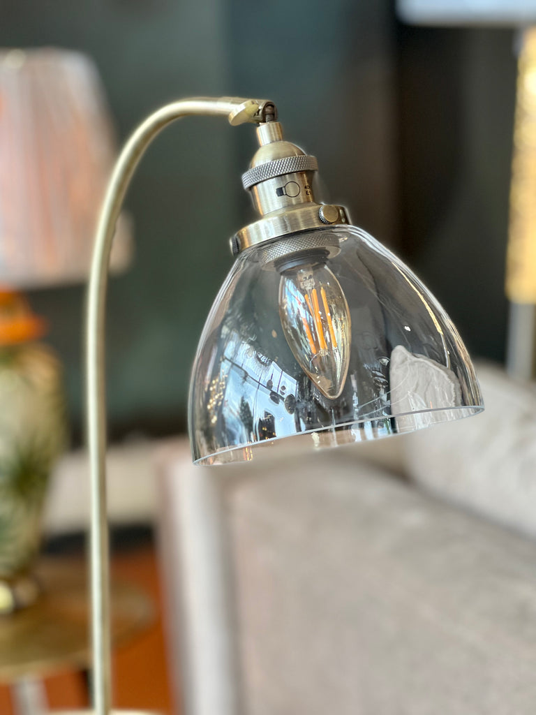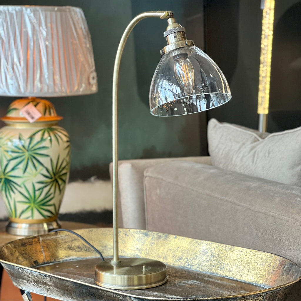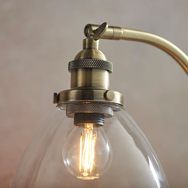 An authentic 'resto' style adjustable table light, finished in antique brass plating with authentic knurled lamp holder details and clear glass shades . Featuring an adjustable knuckle and accessible on/off switch, pair this table light with filament LED lamps for that perfect industrial style. The perfect addition for today's stylish homes to create that on trend bar, bistro look.