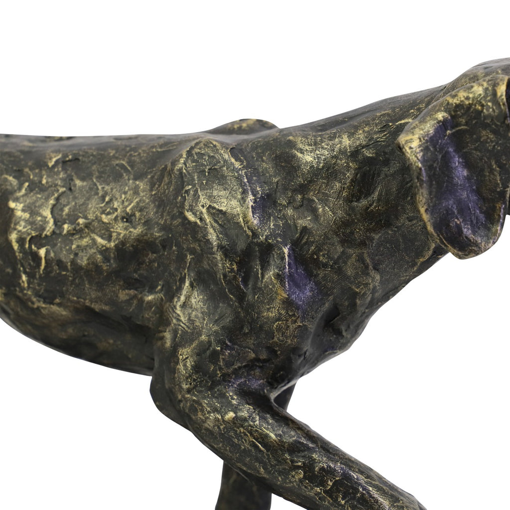 Hunter Dog Sculpture—Crafted with remarkable attention to detail, this sculpture portrays a dog in mid-stride, sniffing the air with keen instinct. Its powerful posture reflects both strength and elegance as it walks with purpose, embodying the determination and grace of a skilled hunter. Cast in high-quality resin and hand finished with a rich antique bronze coating, the sculpture rests on a sleek matt black plinth, enhancing its contemporary appeal. This sculpture is perfect for dog lovers or anyone who enjoys the animal kingdom.