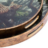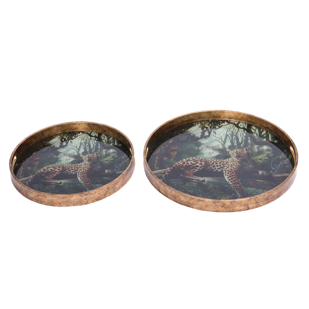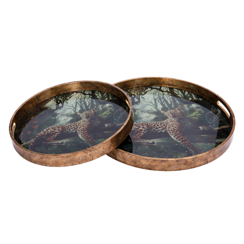 A bold and practical accent, this circular tray showcases our dramatic Lounging Leopard design—an intricately printed jungle scene encased beneath smooth glass for a polished, durable surface. Framed by a painted antique gold-effect rim, it brings colour, character, and quiet opulence to any interior. Ideal for serving drinks, styling a coffee table, or displaying treasured objects.