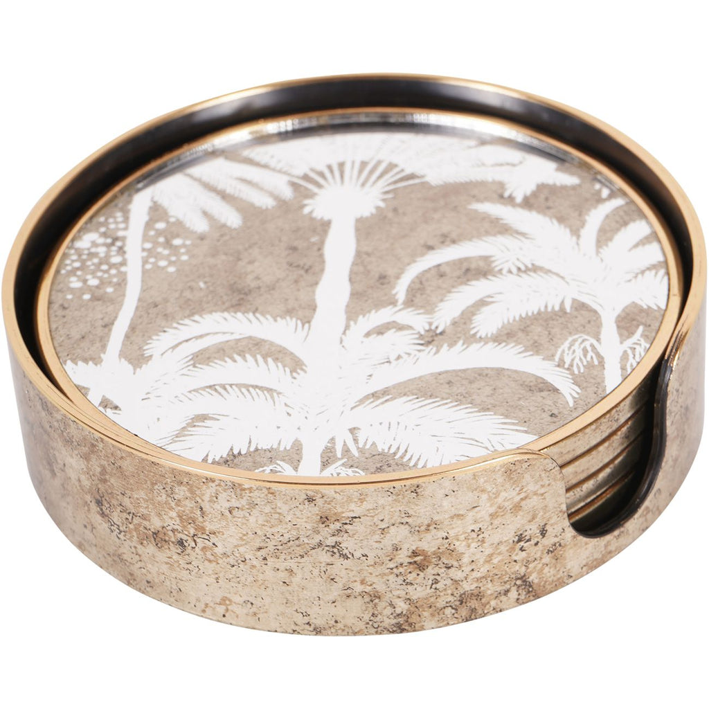 Palm trees are iconic tropical plants known for their slender, tall trunks and feather-like fronds, and they can thrive in diverse climates, from arid deserts to lush rainforests. Our Palm Tree collection uses mirror under antique gold print to create an iconic, beautiful design. Coasters, trays, and tables all available in this design.